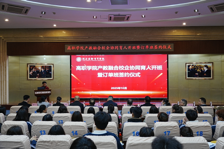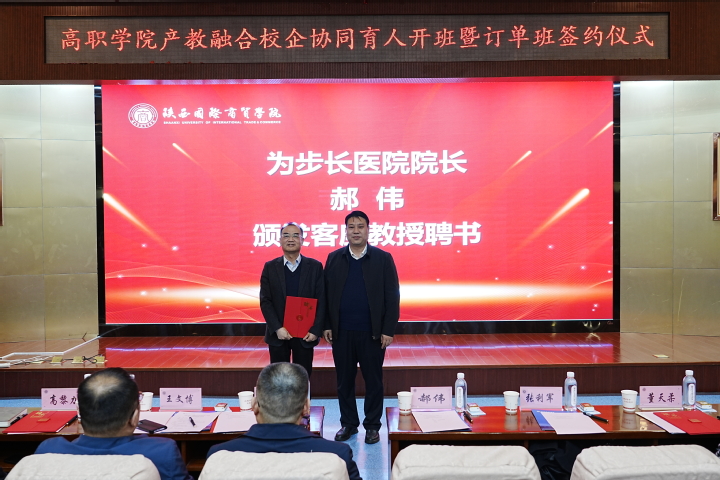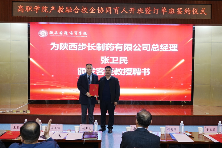 本网讯:10月22日下午,陕西国际商贸学院高职学院产教融合校企协同育人开班暨订单班签约仪式在学术报告厅二楼举行。陕西步长制药有限公司总经理张卫民及其团队成员,步长医院院长郝伟及其团队成员,校长助理王文博、张利军,教务处、人力资源处、产教融合中心、教师发展中心、招生就业处等职能部门的负责人,高职学院领导班子和师生代表出席仪式。仪式由高职学院相关负责人主持。
