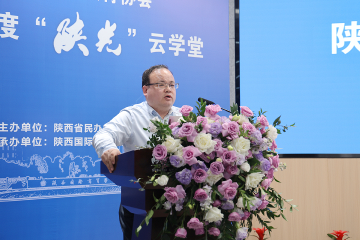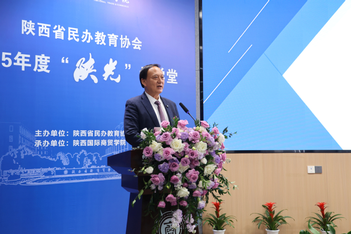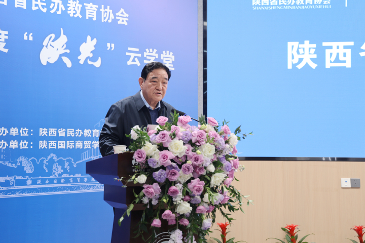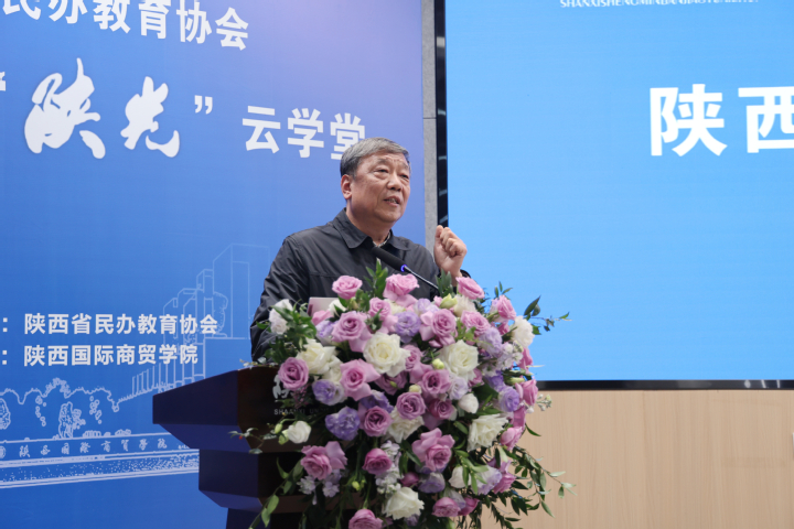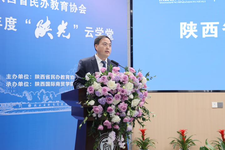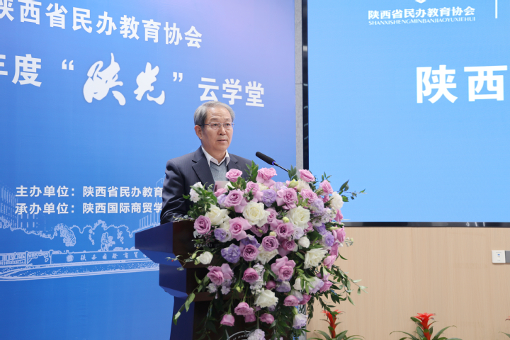 陕西国际商贸学院执行校长贾明远代表学校党政领导班子及全体师生员工,向出席活动的领导、来宾及同仁表示欢迎,向长期关心支持学校发展的各界朋友表示感谢,并简要介绍学校的发展历程、办学理念与教学成果。他表示,学校董事长、校长赵超兼具企业家精神与教育家情怀,在民办教育及产教融合领域积累了丰富经验,他提出的“三结合 五赋能”应用型人才培养理念为学校深化产教融合实践、提升人才培养质量指明了方向。此次承办第七期“陕光”云学堂,既是对学校过往办学成效的肯定,更是对推动学校迈向高质量发展的有力鞭策。期待与会专家学者能以本次活动为契机,加强互学互鉴、共商发展路径,为陕西民办教育高质量发展注入更强动力。
