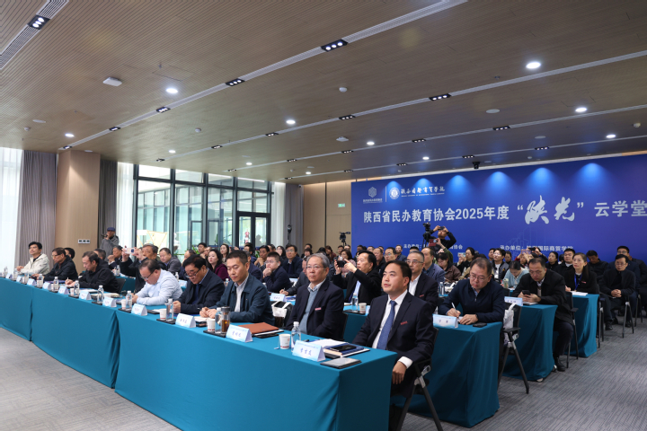 本次云学堂由陕西省民办教育协会主办、陕西国际商贸学院承办,采用线上线下相结合方式举办。陕西省民办教育协会会长郝利生,陕西省教育厅校外教育培训监管处(民办教育处)处长陈国栋,原陕西省教育厅二级巡视员李维民,中国民办教育协会党建专委会副理事长、省民办教育协会党建专委会主任闵小平,陕西省民办教育协会秘书长岳沛磊,省内民办院校举办者、校领导及从业者,陕西国际商贸学院董事会领导、全体校领导出席。讲座由我校副校长李吉友主持。